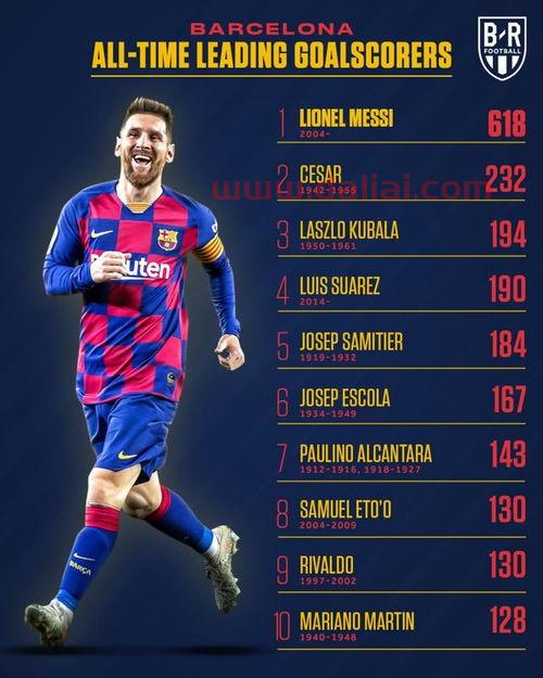 梅西(234个)! 数说梅西:234个进球巴萨史上最多 18次进球3+(来自***) 梅西234个进球超过传奇前锋塞萨尔(232个进球),成为巴塞罗那俱乐部历史上进球最多的球员。