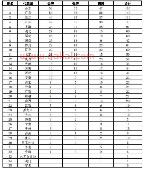 3、共有46个代表团的12000名运动员参加,规模超过前十届。第十一届全运会奖牌情况:十一运会比赛共产生金牌411枚,银牌396枚,铜牌436枚。