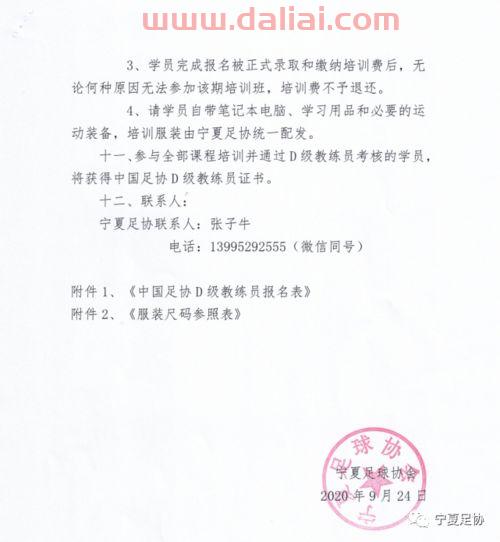 4、足球教练证考取流程需要咨询当地足协,一般需要领取国家D级教练员报考申请表,填写完毕并且提交以后等待培训通知。